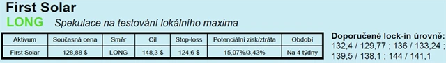Technické indikátory dávají jasný signál, že akcie First Solar mohou po konsolidaci opět posílit. Jediným významnějším rizikem posílení může být klesající trendová linie posledních lokálních vrcholů.