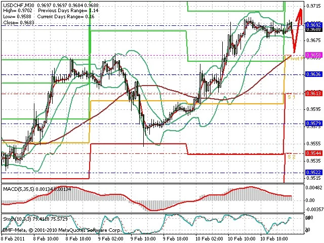 Předpokládaný pohyb pro dnešní den LONG. Případné vstupy do obchodu z hladiny 0.966 s předpokládaným cílem 0.971, případně až 0.975. Proražení hladiny 0.966 může vést k pohybu s pravděpodobným cílem 0.9625 až 0.9585.