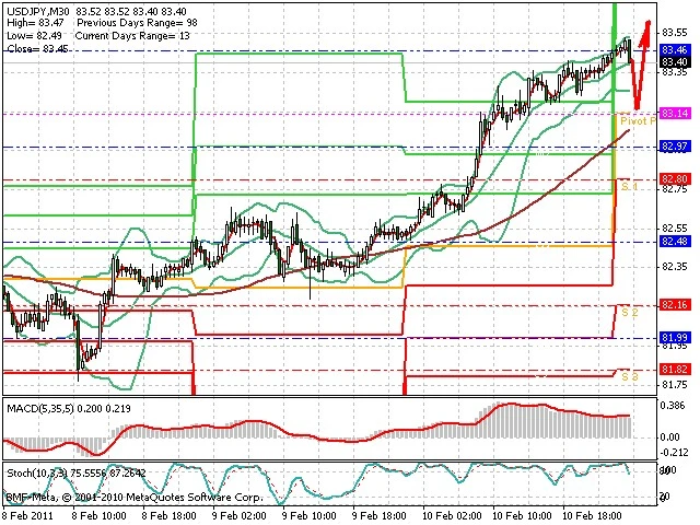 Předpokládaný pohyb pro dnešní den LONG. Případné vstupy do obchodu z hladiny 83.15 s předpokládaným cílem 83.65, případně až 83.95. Proražení hladiny 83.05 může vést k pohybu s pravděpodobným cílem 82.8 až 82.45.