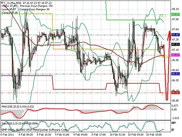 Předpokládaný pohyb pro dnešní den LONG. Případné vstupy do obchodu z hladiny 85.85 s předpokládaným cílem 87.9, případně až 88.5. Proražení hladiny 85.85 může vést k pohybu s pravděpodobným cílem 85.15 až 84.