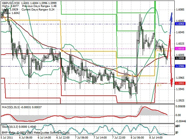 Předpokládaný pohyb pro dnešní den SHORT. Případné vstupy do obchodu z hladiny 1.604 s předpokládaným cílem 1.595, případně až 1.591. Proražení hladiny 1.605 vést k pohybu s pravděpodobným cílem 1.608 až 1.61.