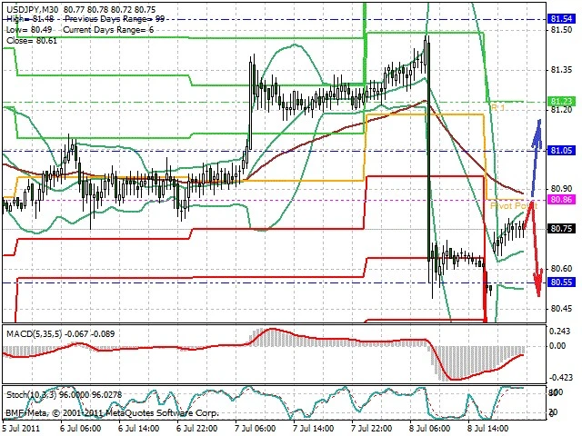 Předpokládaný pohyb pro dnešní den SHORT. Případné vstupy do obchodu z hladiny 80.85 s předpokládaným cílem 80.5, případně až 80.3. Proražení hladiny 80.9 může vést k pohybu s pravděpodobným cílem 81.15 až 81.45.