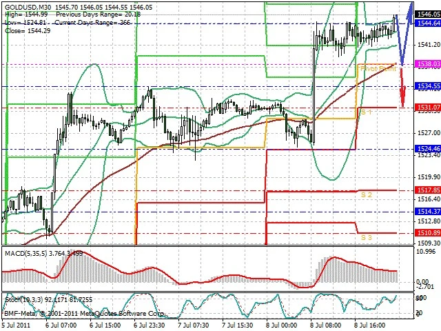 Předpokládaný pohyb pro dnešní den LONG. Případné vstupy do obchodu z hladiny 1 538 s předpokládaným cílem 1 549, případně až 1 558. Proražení hladiny 1 538 může vést k pohybu s pravděpodobným cílem 1 532 až 1 525.