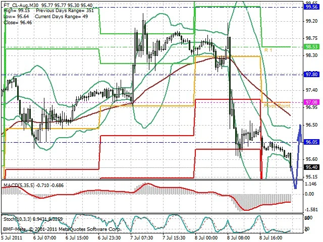 Předpokládaný pohyb pro dnešní den LONG. Případné vstupy do obchodu z hladiny 94.52 s předpokládaným cílem 96.5, případně až 97.9. Proražení hladiny 94.52 může vést k pohybu s pravděpodobným cílem 93.4 až 92.3.
