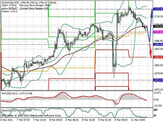 Předpokládaný pohyb pro dnešní den LONG. Případné vstupy do obchodu z hladiny 1 696 s předpokládaným cílem 1 714, případně až 1 724. Proražení hladiny 1 696 může vést k pohybu s pravděpodobným cílem 1 688 až 1 674.