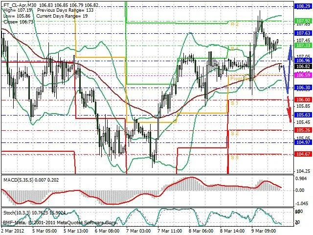 Předpokládaný pohyb pro dnešní den LONG. Případné vstupy do obchodu z hladiny 106.15 s předpokládaným cílem 107.35 případně až 108.15. Proražení hladiny 106.15 může vést k pohybu s pravděpodobným cílem 105.5 až 104.4.
