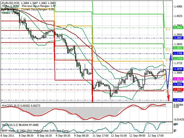 Předpokládaný pohyb pro dnešní den LONG. Případné vstupy do obchodu z hladiny 1.3565 s předpokládaným cílem 1.3785, případně až 1.388. Proražení hladiny 1.3555 může vést k pohybu s pravděpodobným cílem 1.3495 až 1.341.