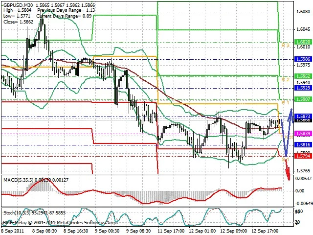 Předpokládaný pohyb pro dnešní den LONG. Případné vstupy do obchodu z hladiny 1.5795 s předpokládaným cílem 1.589, případně až 1.5925. Proražení hladiny 1.5785 může vést k pohybu s pravděpodobným cílem 1.5695 až 1.566.