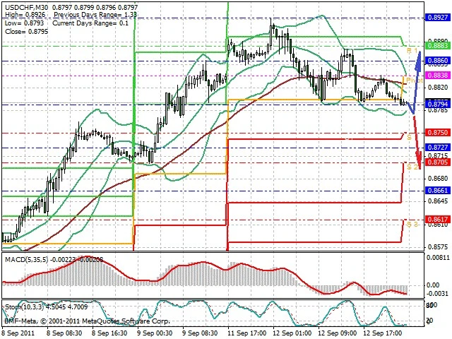 Předpokládaný pohyb pro dnešní den LONG. Případné vstupy do obchodu z hladiny 0.878 s předpokládaným cílem 0.888, případně až 0.893. Proražení hladiny 0.877 může vést k pohybu s pravděpodobným cílem 0.87 až 0.863.