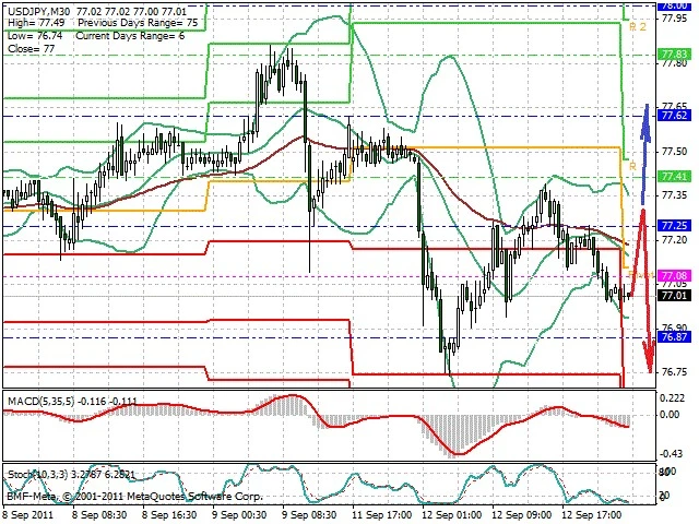 Předpokládaný pohyb pro dnešní den SHORT. Případné vstupy do obchodu z hladiny 77.3 s předpokládaným cílem 76.75, případně až 76.55. Proražení hladiny 77.4 může vést k pohybu s pravděpodobným cílem 77.65 až 77.85.