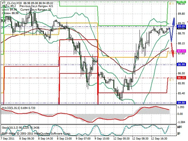 Předpokládaný pohyb pro dnešní den LONG. Případné vstupy do obchodu z hladiny 88.2 s předpokládaným cílem 89.5, případně až 90.45. Proražení hladiny 88.2 může vést k pohybu s pravděpodobným cílem 87.4 až 86.6.