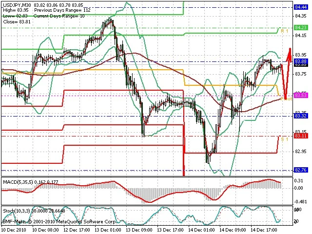 Předpokládaný pohyb pro dnešní den LONG. Případné vstupy do obchodu z hladiny 83.5 s předpokládaným cílem 84.1, případně až 84.3. Proražení hladiny 83.45 může vést k pohybu s pravděpodobným cílem 83.2 až 82.8.