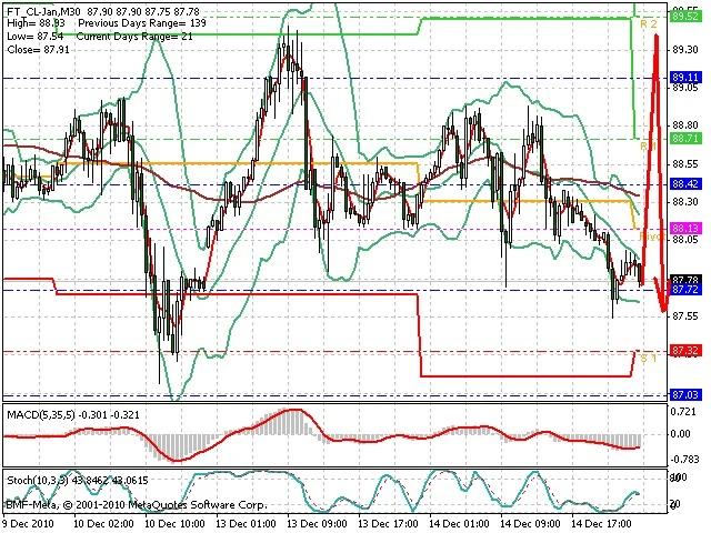 Předpokládaný pohyb pro dnešní den SHORT. Případné vstupy do obchodu z hladiny 89.45 s předpokládaným cílem 87.0, případně až 85.9. Proražení hladiny 89.45 může vést k pohybu s pravděpodobným cílem 90 až 91.8.