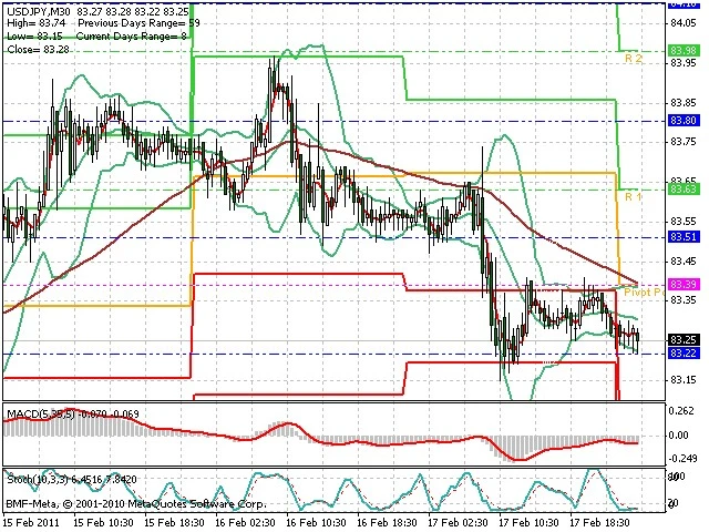 Předpokládaný pohyb pro dnešní den SHORT. Případné vstupy do obchodu z hladiny 83.55 s předpokládaným cílem 83.15, případně až 82.75. Proražení hladiny 83.6 může vést k pohybu s pravděpodobným cílem 83.8 až 84.