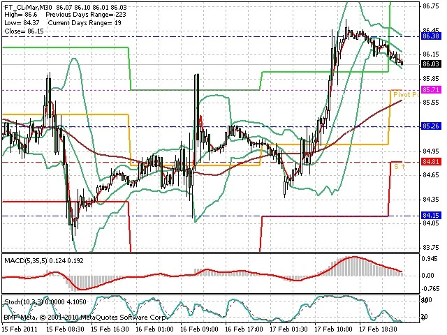 Předpokládaný pohyb pro dnešní den LONG. Případné vstupy do obchodu z hladiny 87.3 s předpokládaným cílem 89.8, případně až 91.05. Proražení hladiny 87.3 může vést k pohybu s pravděpodobným cílem 85.8 až 84.4.