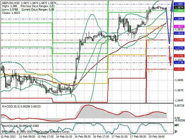 Předpokládaný pohyb pro dnešní den LONG. Případné vstupy do obchodu z hladiny 1.5785 s předpokládaným cílem 1.5925, případně až 1.5945. Proražení hladiny 1.5785 může vést k pohybu s pravděpodobným cílem 1.5735 až 1.569.