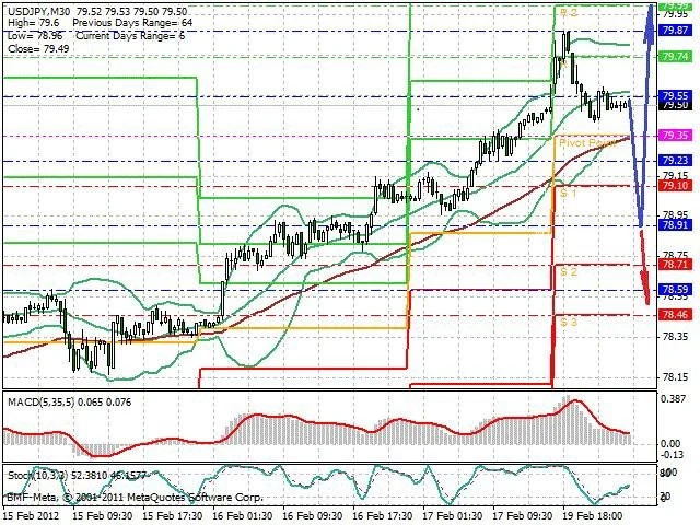 Předpokládaný pohyb pro dnešní den LONG. Případné vstupy do obchodu z hladiny 78.9 s předpokládaným cílem 80, případně až 80.2. Proražení hladiny 78.9 může vést k pohybu s pravděpodobným cílem 78.5 až 78.15.