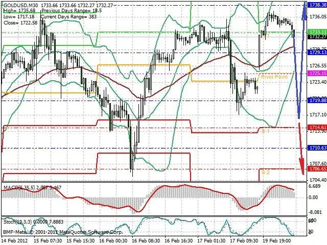 Předpokládaný pohyb pro dnešní den LONG. Případné vstupy do obchodu z hladiny 1 716 s předpokládaným cílem 1 742, případně až 1 752. Proražení hladiny 1 716 může vést k pohybu s pravděpodobným cílem 1 705 až 1 692.