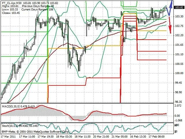 Předpokládaný pohyb pro dnešní den LONG. Případné vstupy do obchodu z hladiny 103.35 s předpokládaným cílem 105.2 případně až 106.5. Proražení hladiny 103.35 může vést k pohybu s pravděpodobným cílem 102 až 100.85.
