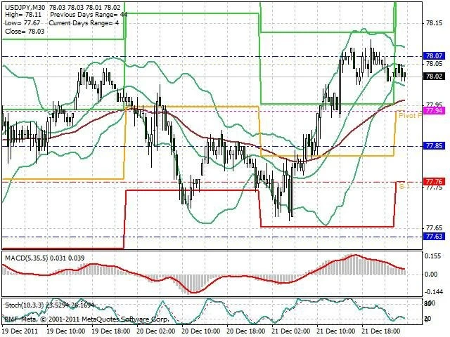 Předpokládaný pohyb pro dnešní den LONG. Případné vstupy do obchodu z hladiny 77.8 s předpokládaným cílem 78.15, případně až 78.35. Proražení hladiny 77.8 může vést k pohybu s pravděpodobným cílem 77.65 až 77.45.