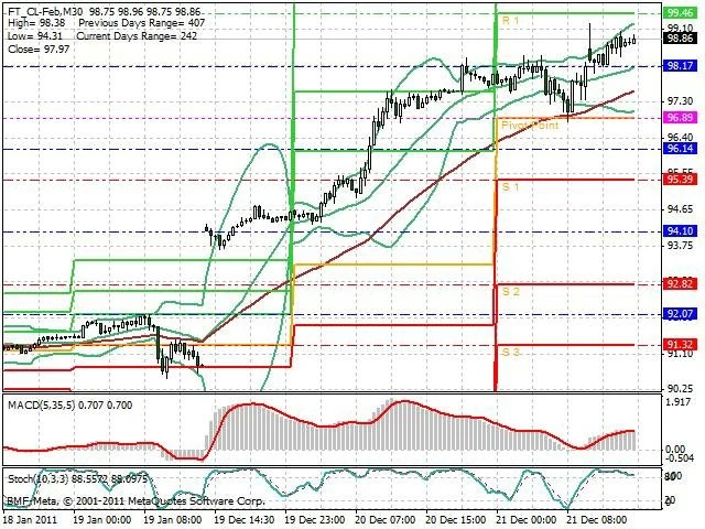 Předpokládaný pohyb pro dnešní den LONG. Případné vstupy do obchodu z hladiny 98 s předpokládaným cílem 99.8 případně až 100.5. Proražení hladiny 98 může vést k pohybu s pravděpodobným cílem 97.3 až 96.75.
