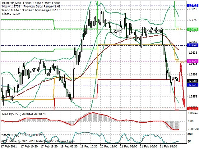 Předpokládaný pohyb pro dnešní den SHORT. Případné vstupy do obchodu z hladiny 1.3615 s předpokládaným cílem 1.356, případně až 1.354. Proražení hladiny 1.3625 může vést k pohybu s pravděpodobným cílem 1.365 až 1.3685.