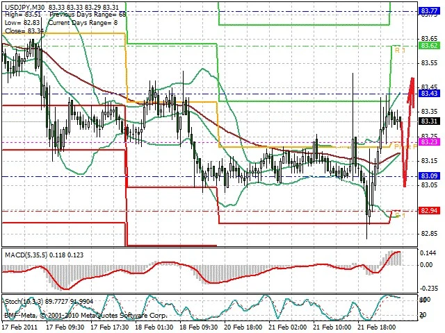 Předpokládaný pohyb pro dnešní den LONG. Případné vstupy do obchodu z hladiny 83.05 s předpokládaným cílem 83.55, případně až 83.75. Proražení hladiny 83 může vést k pohybu s pravděpodobným cílem 82.7 až 82.55.