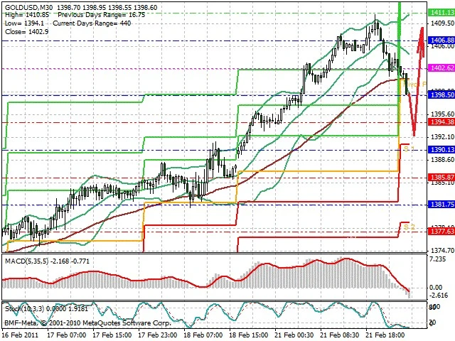Předpokládaný pohyb pro dnešní den LONG. Případné vstupy do obchodu z hladiny 1 392 s předpokládaným cílem 1 410, případně až 1 418. Proražení hladiny 1 392 může vést k pohybu s pravděpodobným cílem 1 382 až 1 374.
