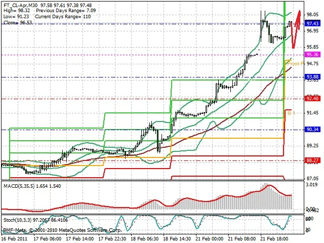 Předpokládaný pohyb pro dnešní den LONG. Případné vstupy do obchodu z hladiny 95.7 s předpokládaným cílem 99.6, případně až 101.7. Proražení hladiny 95.7 může vést k pohybu s pravděpodobným cílem 94.5 až 94.