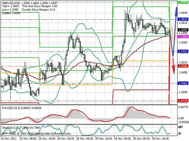 Předpokládaný pohyb pro dnešní den LONG. Případné vstupy do obchodu z hladiny 1.553 s předpokládaným cílem 1.5655, případně až 1.569. Proražení hladiny 1.553 může vést k pohybu s pravděpodobným cílem 1.549 až 1.5455.