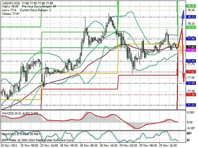 Předpokládaný pohyb pro dnešní den SHORT. Případné vstupy do obchodu z hladiny 78.1 s předpokládaným cílem 77.5, případně až 77.3. Proražení hladiny 78.1 může vést k pohybu s pravděpodobným cílem 78.3 až 78.5.