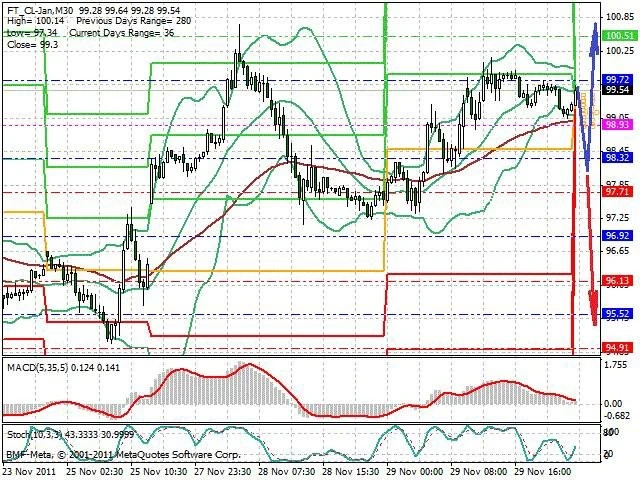 Předpokládaný pohyb pro dnešní den LONG. Případné vstupy do obchodu z hladiny 98.2 s předpokládaným cílem 100.68 případně až 101.4. Proražení hladiny 98.2 může vést k pohybu s pravděpodobným cílem 97.2 až 95.