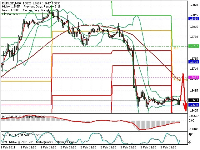 Předpokládaný pohyb pro dnešní den SHORT. Případné vstupy do obchodu z hladiny 1.37 s předpokládaným cílem 1.3605, případně až 1.357. Proražení hladiny 1.37 může vést k pohybu s pravděpodobným cílem 1.375 až 1.383.