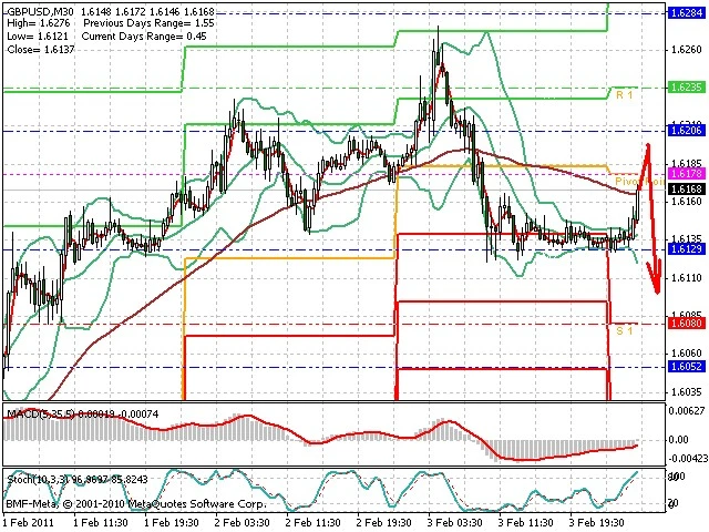 Předpokládaný pohyb pro dnešní den SHORT. Případné vstupy do obchodu z hladiny 1.62 s předpokládaným cílem 1.6115, případně až 1.607. Proražení hladiny 1.62 může vést k pohybu s pravděpodobným cílem 1.6235 až 1.628.
