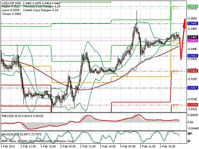 Předpokládaný pohyb pro dnešní den LONG. Případné vstupy do obchodu z hladiny 0.9425 s předpokládaným cílem 0.95, případně až 0.9525. Proražení hladiny 0.9425 může vést k pohybu s pravděpodobným cílem 0.94 až 0.936.