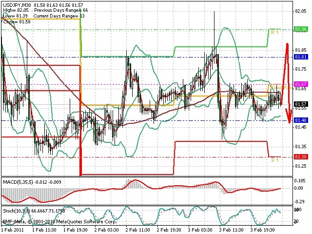 Předpokládaný pohyb pro dnešní den SHORT. Případné vstupy do obchodu z hladiny 81.9 s předpokládaným cílem 81.3, případně až 81.1. Proražení hladiny 81.9 může vést k pohybu s pravděpodobným cílem 82.05 až 82.25.