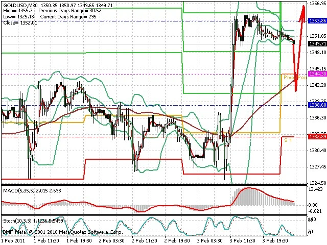 Předpokládaný pohyb pro dnešní den LONG. Případné vstupy do obchodu z hladiny 1 340 s předpokládaným cílem 1 356, případně až 1 362. Proražení hladiny 1 340 může vést k pohybu s pravděpodobným cílem 1 330 až 1 324.