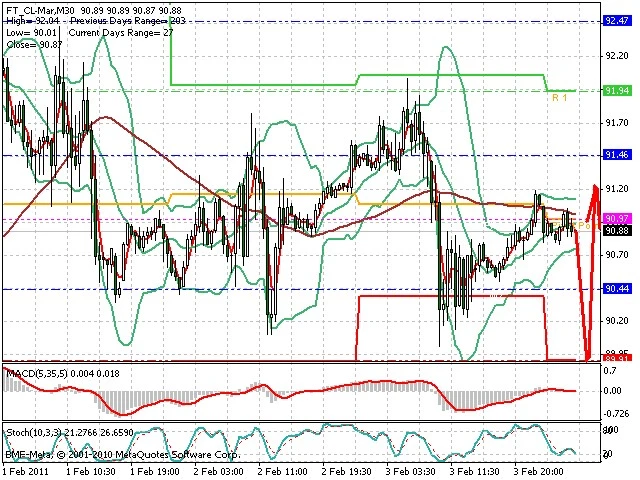 Předpokládaný pohyb pro dnešní den LONG. Případné vstupy do obchodu z hladiny 89 s předpokládaným cílem 92, případně až 93. Proražení hladiny 89 může vést k pohybu s pravděpodobným cílem 87.6 až 86.6.