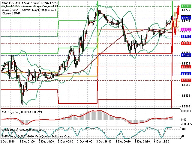 Předpokládaný pohyb pro dnešní den LONG. Případné vstupy do obchodu z hladiny 1.5705 s předpokládaným cílem 1.579, případně až 1.5835. Proražení hladiny 1.5695 může vést k pohybu s pravděpodobným cílem 1.565 až 1.561.