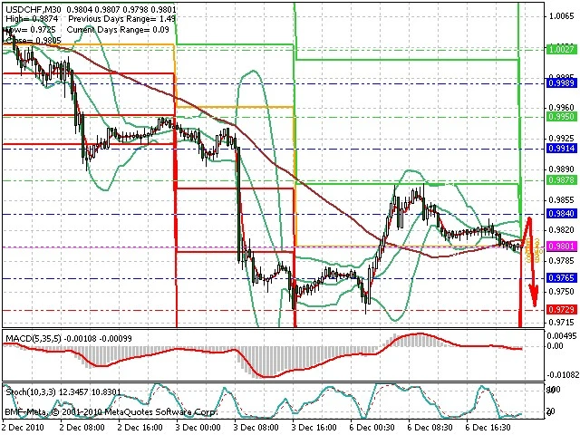 Předpokládaný pohyb pro dnešní den SHORT. Případné vstupy do obchodu z hladiny 0.9835 s předpokládaným cílem 0.976, případně až 0.972. Proražení hladiny 0.9835 může vést k pohybu s pravděpodobným cílem 0.9875 až 0.9925.