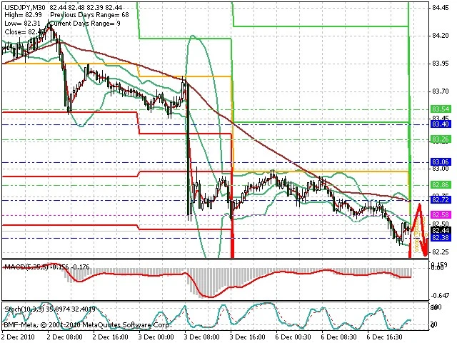Předpokládaný pohyb pro dnešní den SHORT. Případné vstupy do obchodu z hladiny 82.7 s předpokládaným cílem 82.3, případně až 82.1. Proražení hladiny 82.75 může vést k pohybu s pravděpodobným cílem 83.0 až 83.15.