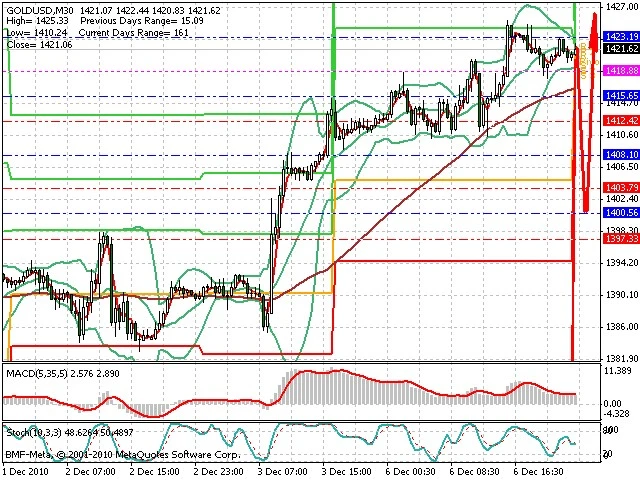 Předpokládaný pohyb pro dnešní den LONG. Případné vstupy do obchodu z hladiny 1 400 s předpokládaným cílem 1 437, případně až 1 450. Proražení hladiny 1 400 může vést k pohybu s pravděpodobným cílem 1 380 až 1 365.