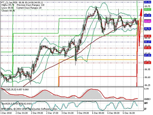 Předpokládaný pohyb pro dnešní den LONG. Případné vstupy do obchodu z hladiny 88.0 s předpokládaným cílem 90.0, případně až 91.8. Proražení hladiny 88 může vést k pohybu s pravděpodobným cílem 87 až 85.9.