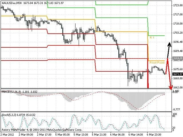 Předpokládaný pohyb pro dnešní den SHORT. Případné vstupy do obchodu z hladiny 1 684 s předpokládaným cílem 1 657, případně až 1 640. Proražení hladiny 1 684 může vést k pohybu s pravděpodobným cílem 1 695 až 1 705.