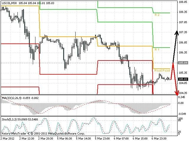 Předpokládaný pohyb pro dnešní den SHORT. Případné vstupy do obchodu z hladiny 105.85 s předpokládaným cílem 104 případně až 103.2. Proražení hladiny 105.85 může vést k pohybu s pravděpodobným cílem 107.45 až 108.