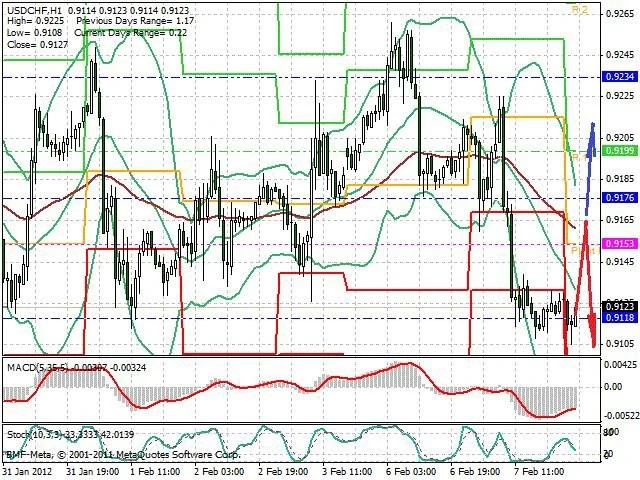 Předpokládaný pohyb pro dnešní den SHORT. Případné vstupy do obchodu z hladiny 0.9165 s předpokládaným cílem 0.9105, případně až 0.908. Proražení hladiny 0.9165 může vést k pohybu s pravděpodobným cílem 0.921 až 0.9255.