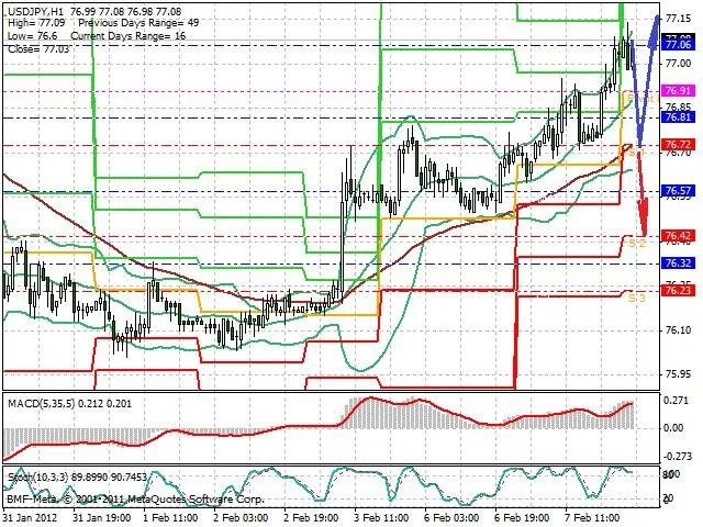 Předpokládaný pohyb pro dnešní den LONG. Případné vstupy do obchodu z hladiny 76.7 s předpokládaným cílem 77.15, případně až 77.25. Proražení hladiny 76.7 může vést k pohybu s pravděpodobným cílem 76.45 až 76.25.