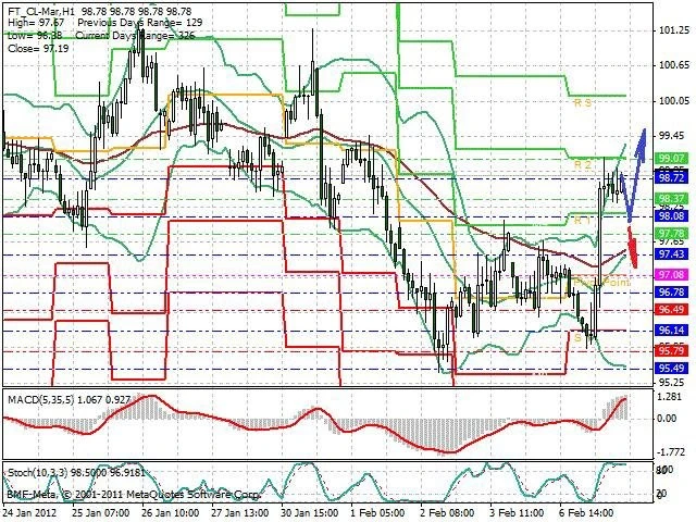 Předpokládaný pohyb pro dnešní den LONG. Případné vstupy do obchodu z hladiny 98 s předpokládaným cílem 99.5 případně až 100.15. Proražení hladiny 98 může vést k pohybu s pravděpodobným cílem 97.5 až 97.1.