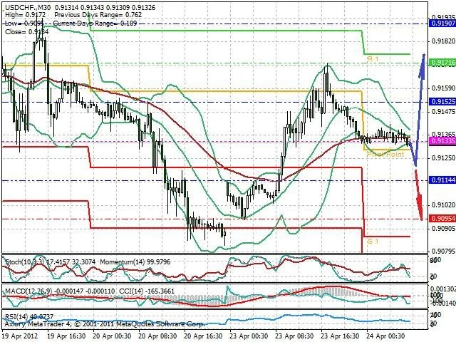 Předpokládaný pohyb pro dnešní den LONG. Případné vstupy do obchodu z hladiny 0.912 s předpokládaným cílem 0.9175, případně až 0.9195. Proražení hladiny 0.912 může vést k pohybu s pravděpodobným cílem 0.9095 až 0.9075.