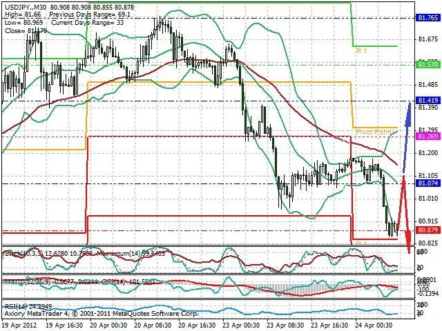 Předpokládaný pohyb pro dnešní den SHORT. Případné vstupy do obchodu z hladiny 81.1 s předpokládaným cílem 80.8, případně až 80.6. Proražení hladiny 81.15 může vést k pohybu s pravděpodobným cílem 81.4 až 81.65.